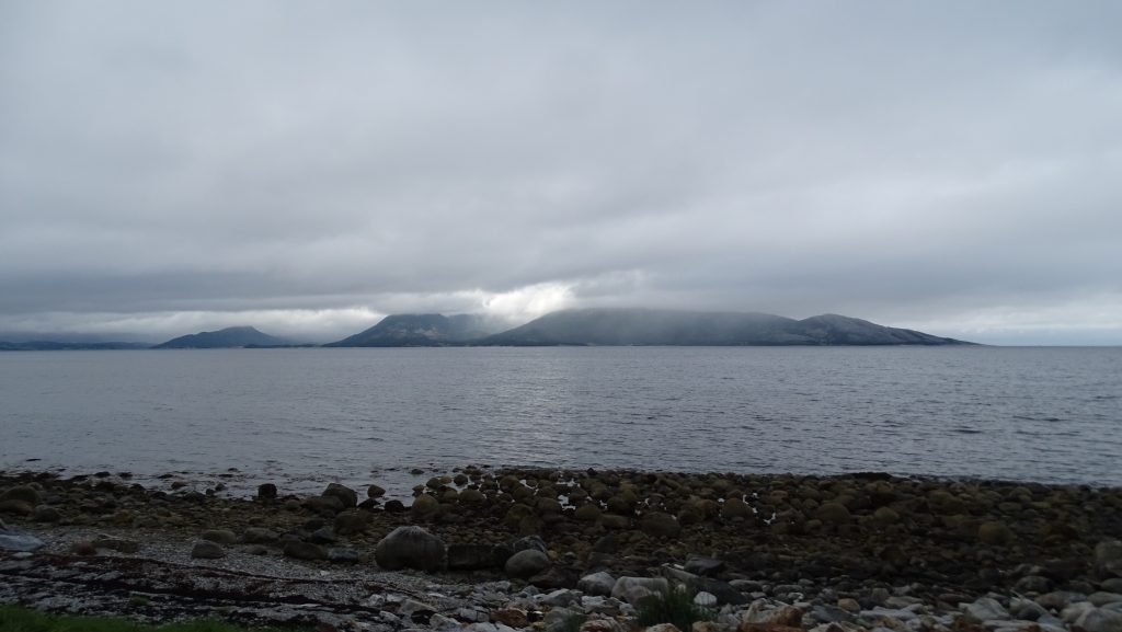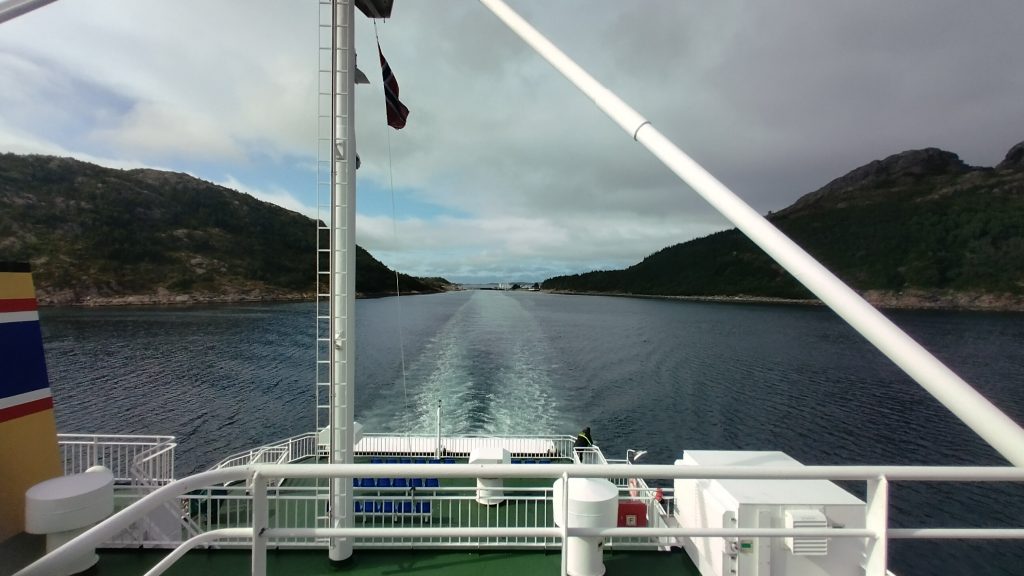Das Wetter zeigte sich leider mal wieder von seiner nicht so schönen Seite. Der Nebel vom Abend zuvor hatte sich zwar verzogen, aber es hörte einfach nicht auf zu nieseln. Also nutzen wir das schlechte Wetter zum Wäsche waschen und um den Spielplatz in Brønnøysund mit Regenanzug aufzusuchen. Danach füllten wir nochmal unserer Wasser auf und fuhren ein paar Kilometer weiter Richtung Süden. Geplant war eigentlich noch ein kurzer Stopp bei einem Steinweg im Wasser einer kleinen Bucht (Trælvikosen). Allerdings war gerade Ebbe, so dass das Schauspiel nicht ganz so spannend war. Also fuhren wir ohne Halt direkt weiter zur nächsten Fähre von Vennesund nach Holm. Danach entschieden wir uns noch einen Abstecher in die Region von Austafjord zu machen.