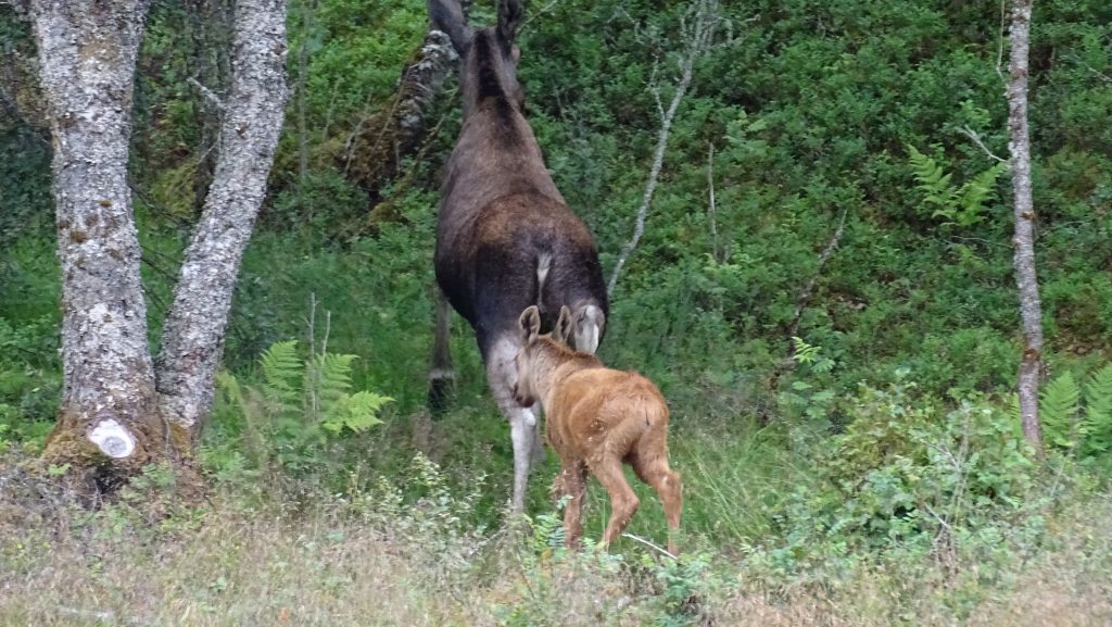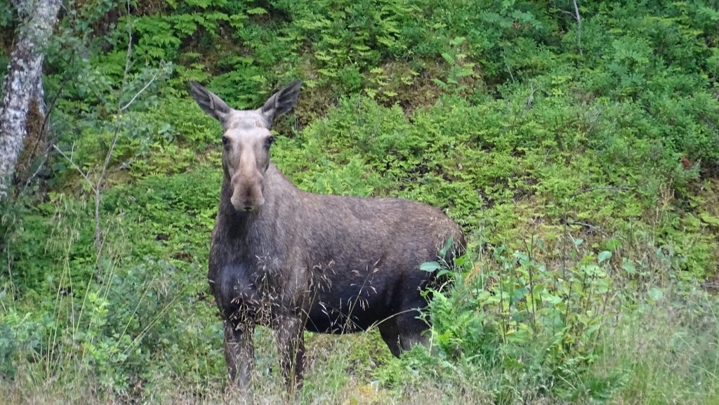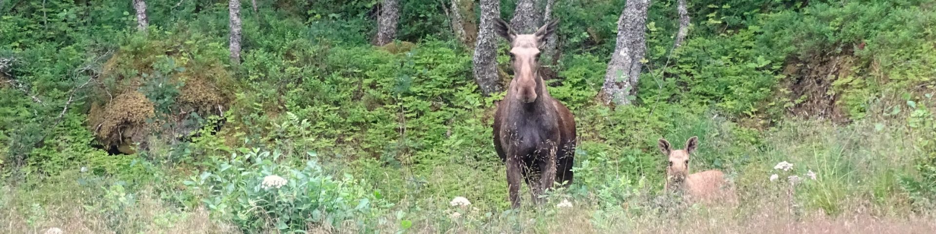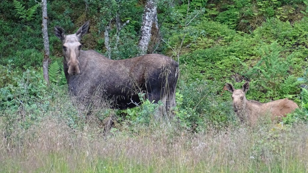 Und es hat sich gelohnt! Trotz dem schlechten Wetter zeigte sich uns eine tolle Landschaft, mit vielen kleinen Inseln, aber zur Abwechslung auch Mal viel Landwirtschaft. Neben Kühen, Pferden und Ziegen, haben wir zu unserer Überraschung einige Rehe gesehen. Und auch die erhofften Elche blieben nicht aus. Auf den letzten Kilometern vor unserem Ziel, sahen wir wieder nur wenige Meter von uns entfernt eine Elchkuh mit ihrem Jungen.