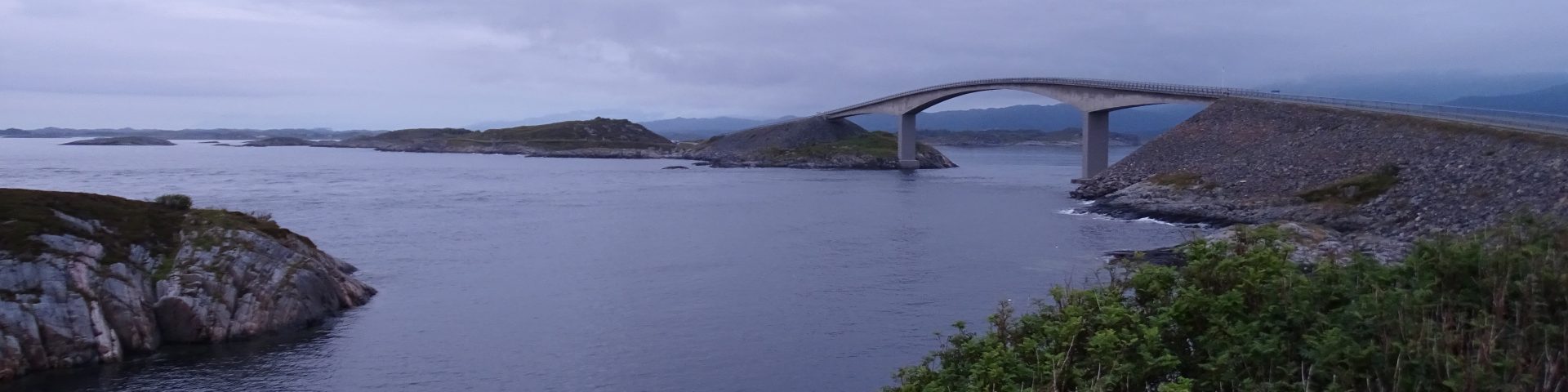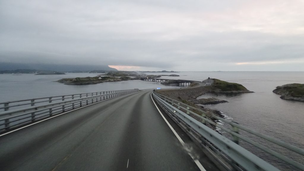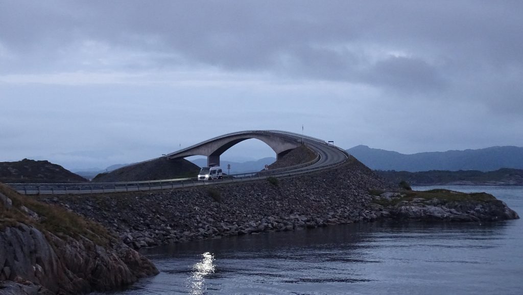 Von Trondheim zieht es uns weiter auf der E39 nochmal Richtung Küste. In Hennset nehmen wir die Fähre nach Vågosen und von da die 682 und 680 nach Kristiansund. Dort angekommen biegen wir ab zur berühmten Atlantikstraße (Atlanterhavsveien), die wir in der Abenddämmerung erreichen.