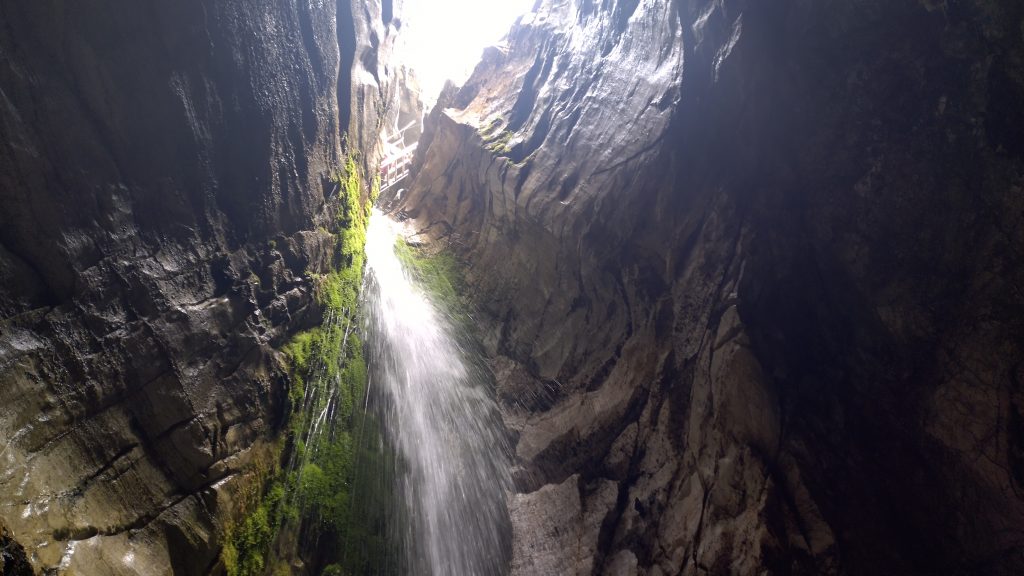 Wir genießen erstmal die Aussicht und nach einer kurzen Verschnaufpause, geht’s dann auch gut 100 m tief in die dunkle und ziemlich kalte Höhe. Über Geröll und Gestein entlang des Wassers, erreichten wir den Wasserfall, der in die Marmor-Grotte fällt. Ein unbeschreibliches Schauspiel und die ganze Anstrengung wert.