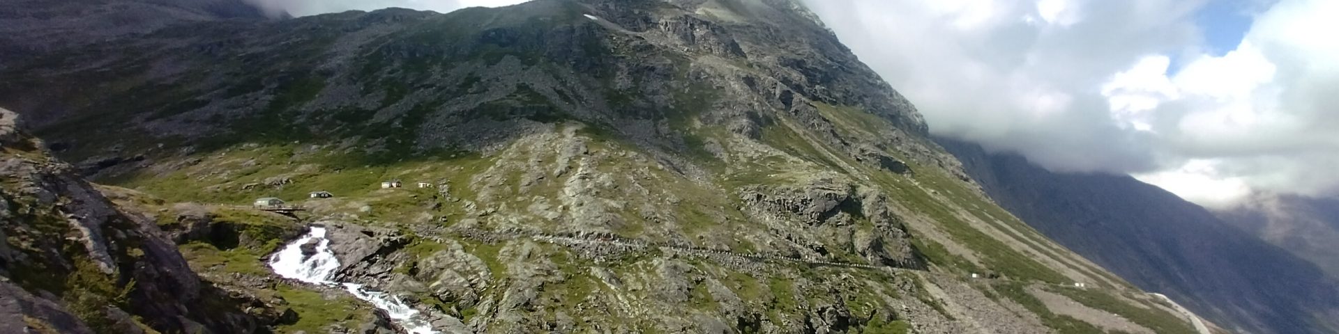 Los ging nur knapp 20 km hinter Andalsnes mit den Trollstigen. Nachdem wir kurzen den Anblick vom Parkplatz unterhalb der schmalen Serpentinen nochmal mit der Kamera festhielten fuhren wir hinauf. Die Fahrt rauf dauerte etwa 30 min. Und vielleicht waren wir noch schneller gewesen, wäre nicht andauernd ein kleiner Stau auf den schmalen Straßen, wo sich Busse und Wohnmobile kreuzten. Tatsächlich hatten wir noch sehr viel Glück, den den Tag vorher waren die Trollstigen noch gesperrt, wegen herunter gefallenen Geröll.