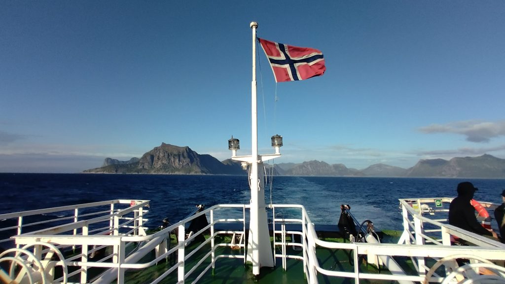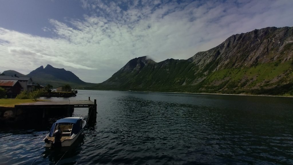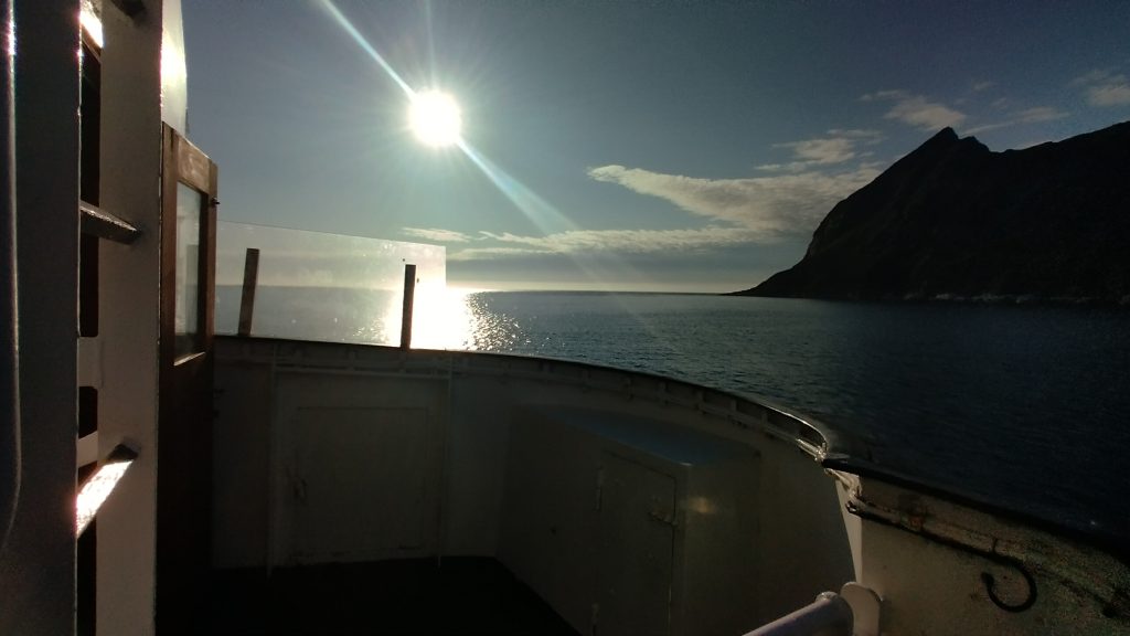 In Gryllefjord angekommen, müssten wir uns erstmal in eine Reihe von PKWs und Wohnmobilen anstellen. Es fährt täglich nur dreimal die Fähre mit je 25-30 Autos und Wohnmobile. Die Plätze für die zweite Überfahrt waren bei unserer Ankunft schon voll. Unser Auto war demnach die Nr. 33. Wir entschieden uns aber noch die eine Stunde bis zur nächsten Fähre abzuwarten und haben dann tatsächlich noch einen Platz für die letzte Fähre in der Wartelinie bekommen. Dann hieß es allerdings erstmal 4 Stunden warten. Die Zeit haben wir uns mit Nudelauflauf aus dem Omnia vertrieben und um 19:00 Uhr ging es dann endlich los.