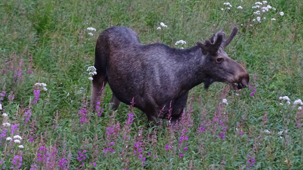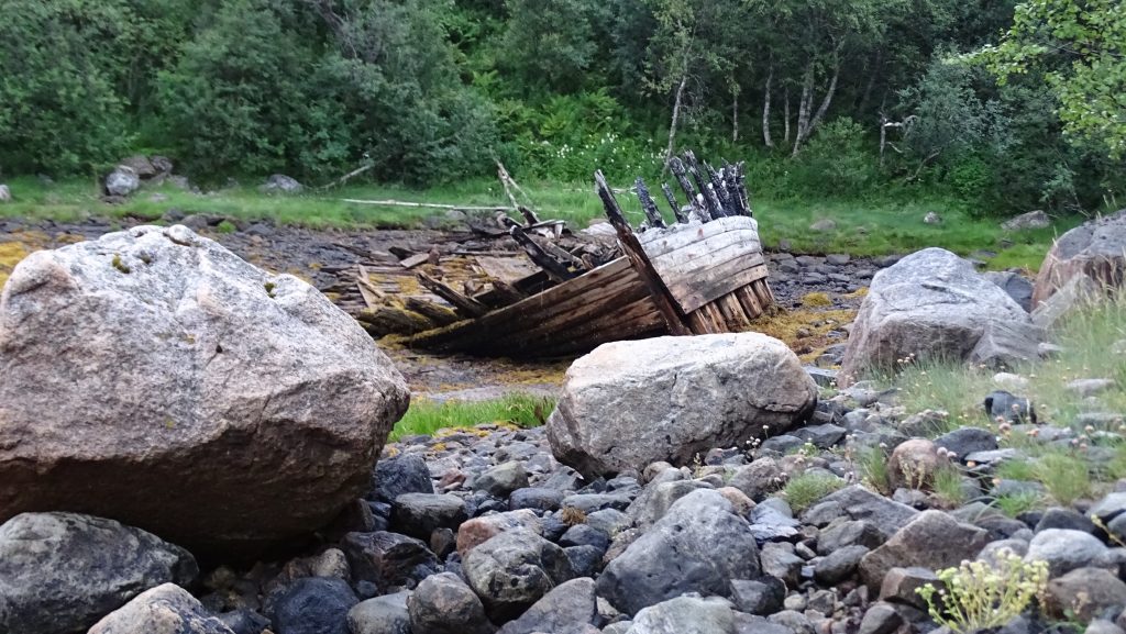Und kurz vor Mitternacht, entdeckten wir noch einen Elch direkt am Straßenrand. Ein relativ junger Bulle, der gemütlich graste. ein altes Schiffswrack verborgen in einer einsamen Bucht.