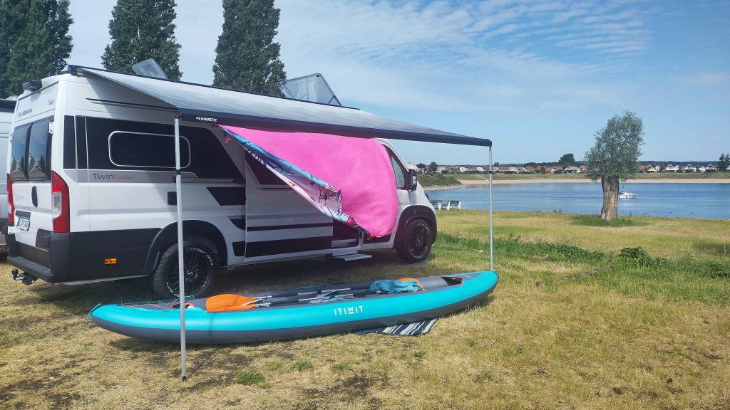 Nach einer erholsamen Nacht und leckerem Frühstück bei bestem Wetter ging es daran, dass nächste Wochenend-Highlight vorzubereiten. Für unsere zukünftigen Reisen haben wir uns ein aufblasbares Kajak zugelegt. Ein Kajak der Marke Itiwit von Decathlon für drei Personen mit Hochdruckboden. Also auch ein bisschen seetauglich und für kleinere Tagestouren bestens geeignet. Der erste Aufbau war dank einer elektrischen Pumpe innerhalb von 30min erledigt. Noch kurz das Reiseproviant gepackt und schon konnte es los gehen.